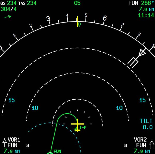 Während der Kurve bleibt das Flugzeug in der Mitte des Navigationsdisplays fest stehen. Stattdessen dreht sich die Kursrose außen herum – bei einer Rechtskurve im Uhrzeigersinn. Der aktuelle Kurs wird dabei immer oben an der farbigen Markierung (meist grün-gelb) angezeigt.
